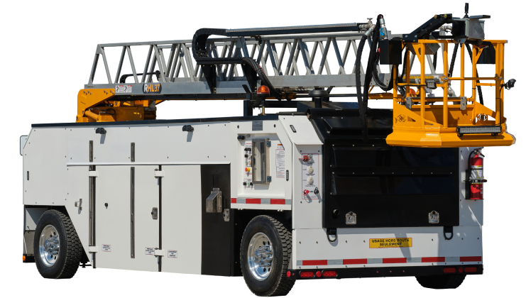 Single operator self propelled deicing truck equipped with RHL 37 or RHL 41 ladder that fully